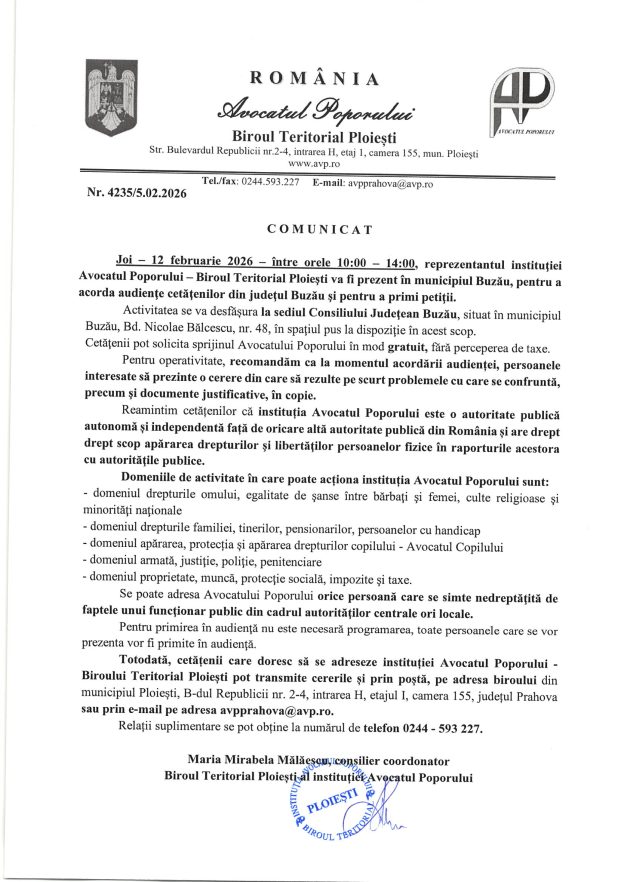 Joi – 12 Februarie 2026 – între orele 10:00 – 14:00, reprezentantul instituţiei Avocatul Poporului – Biroul Teritorial Ploieşti va fi prezent în municipiul Buzău, pentru a acorda audienţe cetăţenilor din judeţul Buzău şi pentru a primi petiţii.