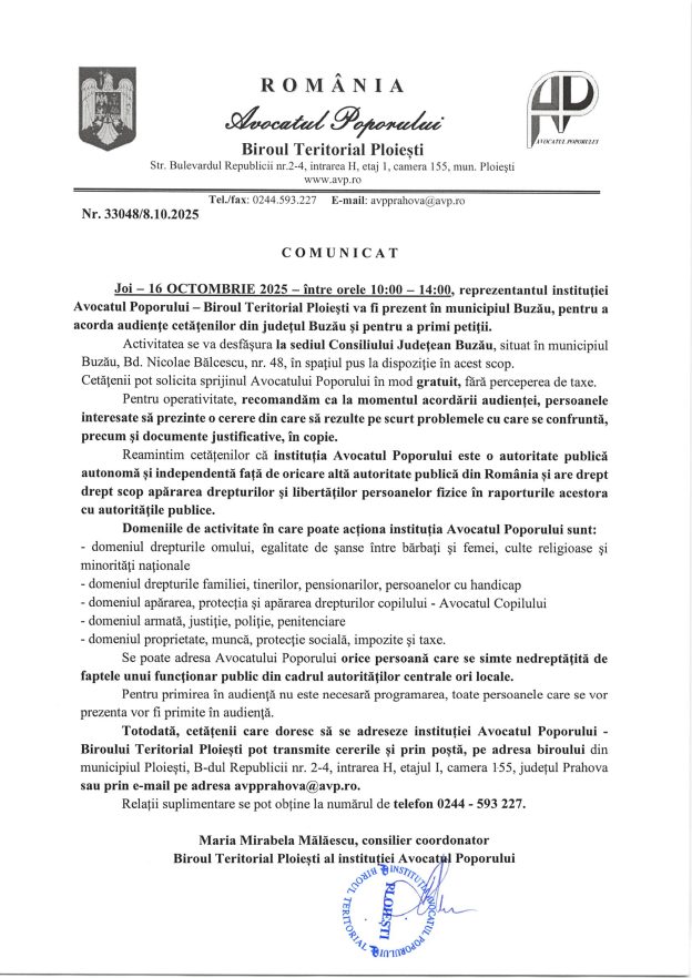 Joi – 16 Octombrie 2025 – între orele 10:00 – 14:00, reprezentantul instituţiei Avocatul Poporului – Biroul Teritorial Ploieşti va fi prezent în municipiul Buzău, pentru a acorda audienţe cetăţenilor din judeţul Buzău şi pentru a primi petiţii.