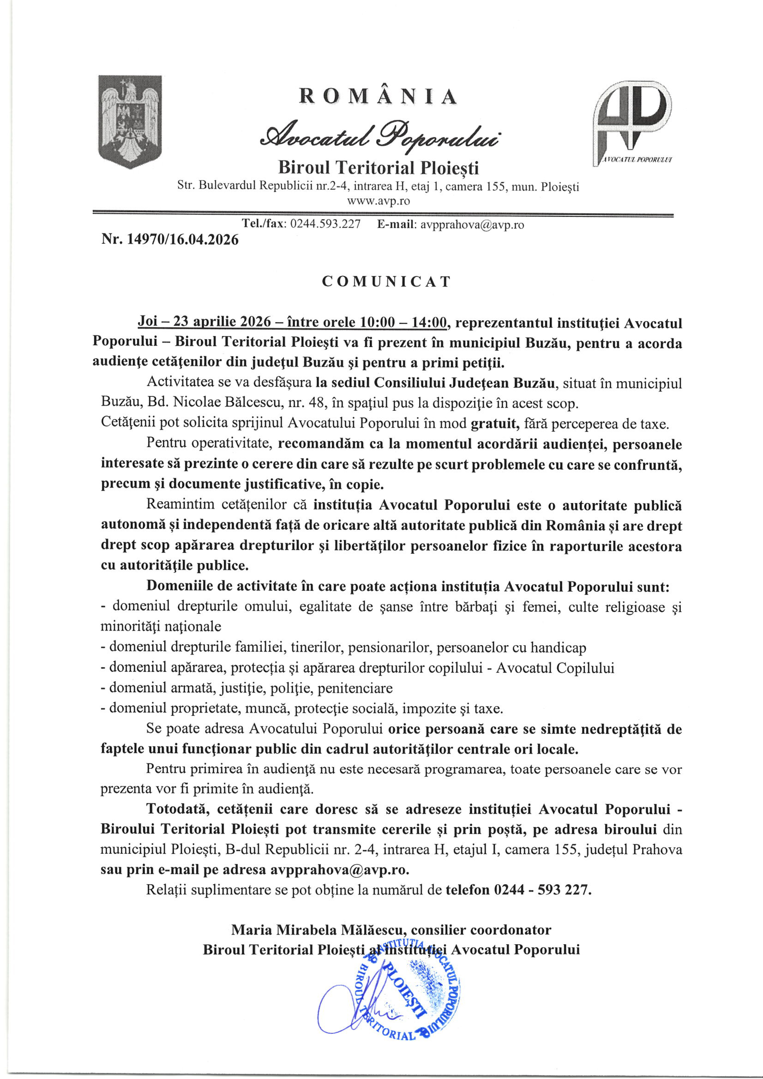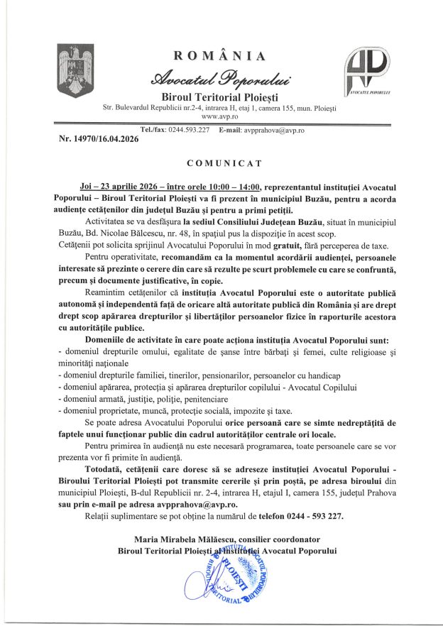 Joi – 23 Aprilie 2026 – între orele 10:00 – 14:00, reprezentantul instituţiei Avocatul Poporului – Biroul Teritorial Ploieşti va fi prezent în municipiul Buzău, pentru a acorda audienţe cetăţenilor din judeţul Buzău şi pentru a primi petiţii.