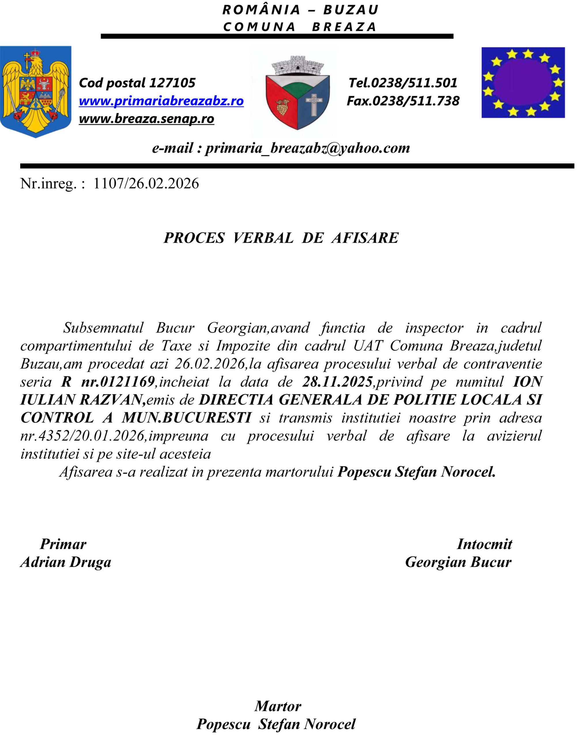 Subsemnatul Bucur Georgian,avand functia de inspector in cadrul compartimentului de Taxe si Impozite din cadrul UAT Comuna Breaza,judetul Buzau,am procedat azi 26.02.2026,la afisarea procesului verbal de contraventie seria R nr.0121169,incheiat la data de 28.11.2025,privind pe numitul ION IULIAN RAZVAN,emis de DIRECTIA GENERALA DE POLITIE LOCALA SI CONTROL A MUN.BUCURESTI si transmis institutiei noastre prin adresa nr.4352/20.01.2026,impreuna cu procesului verbal de afisare la avizierul institutiei si pe site-ul acesteia