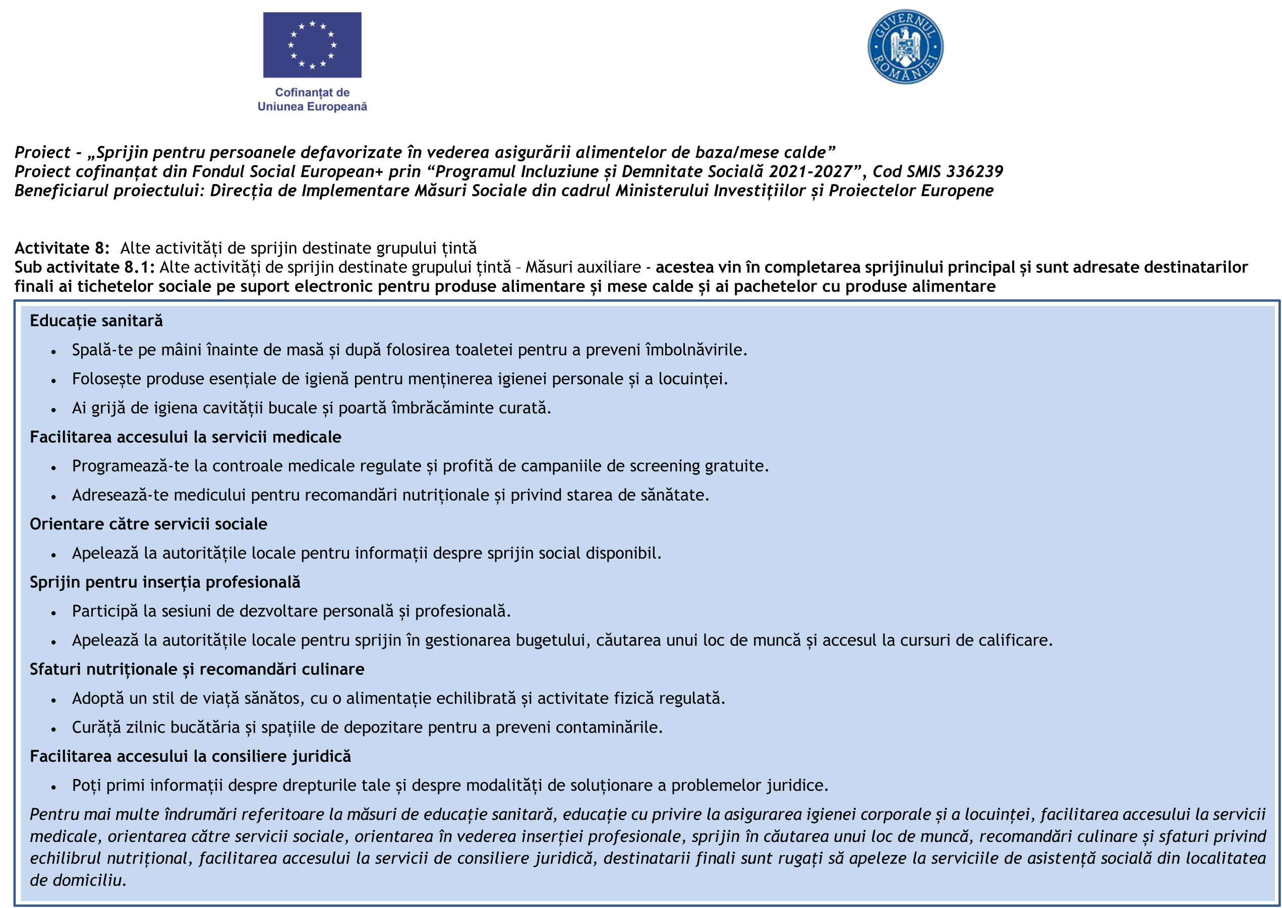 Măsuri auxiliare – acestea vin în completarea sprijinului principal și sunt adresate destinatarilor finali ai tichetelor sociale pe suport electronic pentru produse alimentare și mese calde și ai pachetelor cu produse alimentare